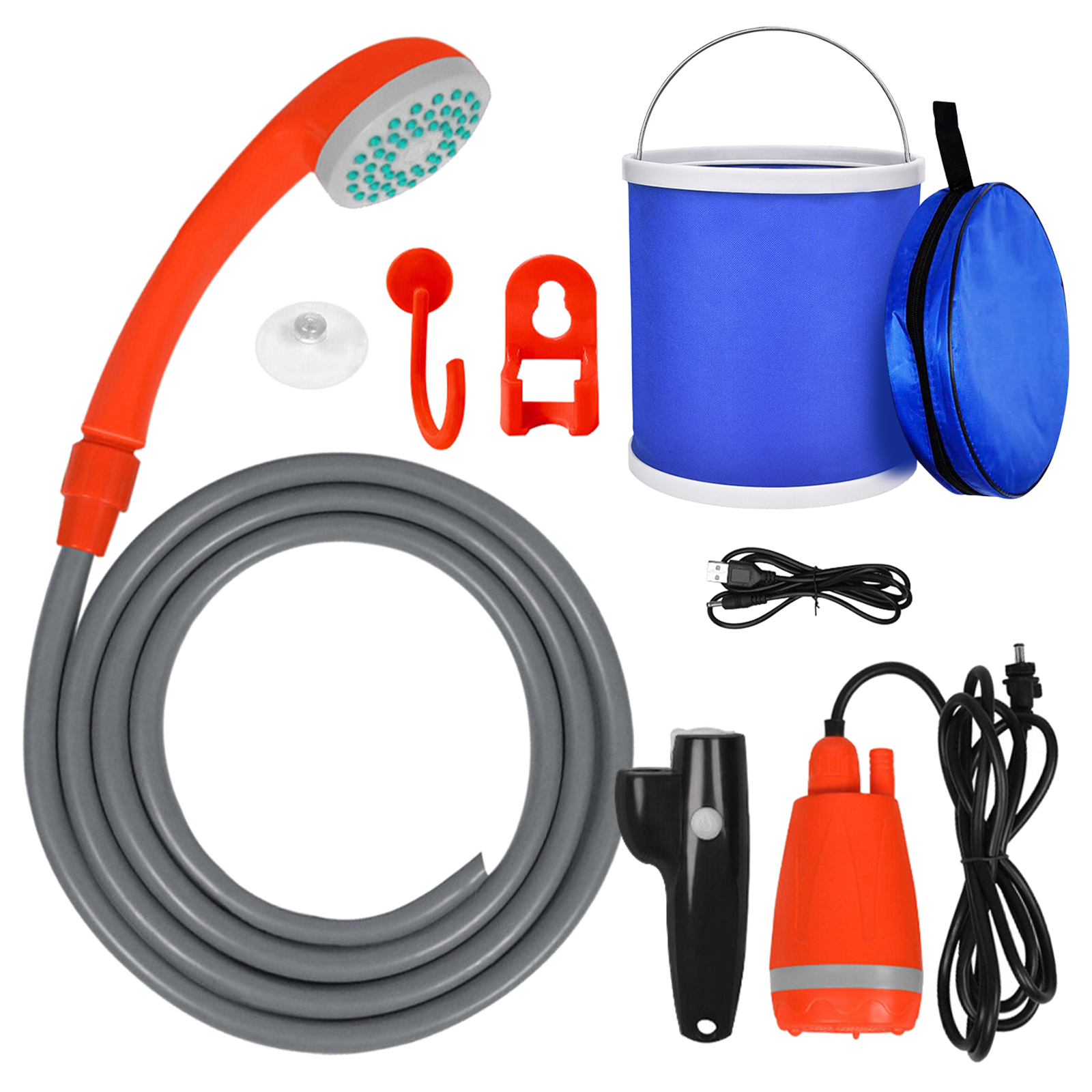جرب رفاهية الاستحمام برا البيت مع طقم الدوش المحمول للرحلات والتخييم. الطقم يجي ويا سطل مي 13 لتر، ليّ ناعم طوله 2 متر، موتور قوي، وسلك شحن USB.